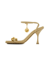 Nappa lambskin heeled sandals in beige. · Curb chain accent at vamp · Detachable spherical charm at adjustable pin-buckle ankle strap · Logo-embossed textured rubber footbed · Covered stiletto heel · Leather sole with rubber injections · Heel: H3.25 in Supplier color: Cane sugar Upper: lambskin, rubber. Sole: leather, rubber. Made in Italy 222798F125025