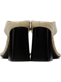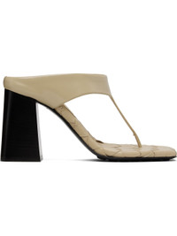 Buffed calfskin heeled sandals in beige. · Thong-style strap at open square toe · Intrecciato-woven lambskin footbed · Stacked leather block heel with rubber injection · Polished leather sole with rubber injections · Heel: H2" Supplier color: Light butterscotch Upper: calfskin. Sole: leather, rubber. Made in Italy 251798F125000