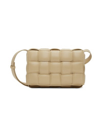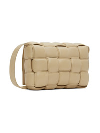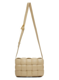 Padded intreccio-woven buffed lambskin messenger bag in beige. · Adjustable shoulder strap with pin-buckle fastening · Foldover flap with tab-slot fastening · Zip pocket at interior · Full lambskin lining · Gold-tone hardware · H7 x W10 x D3 in Supplier color: Porridge gold Lambskin. Made in Italy 221798F048013