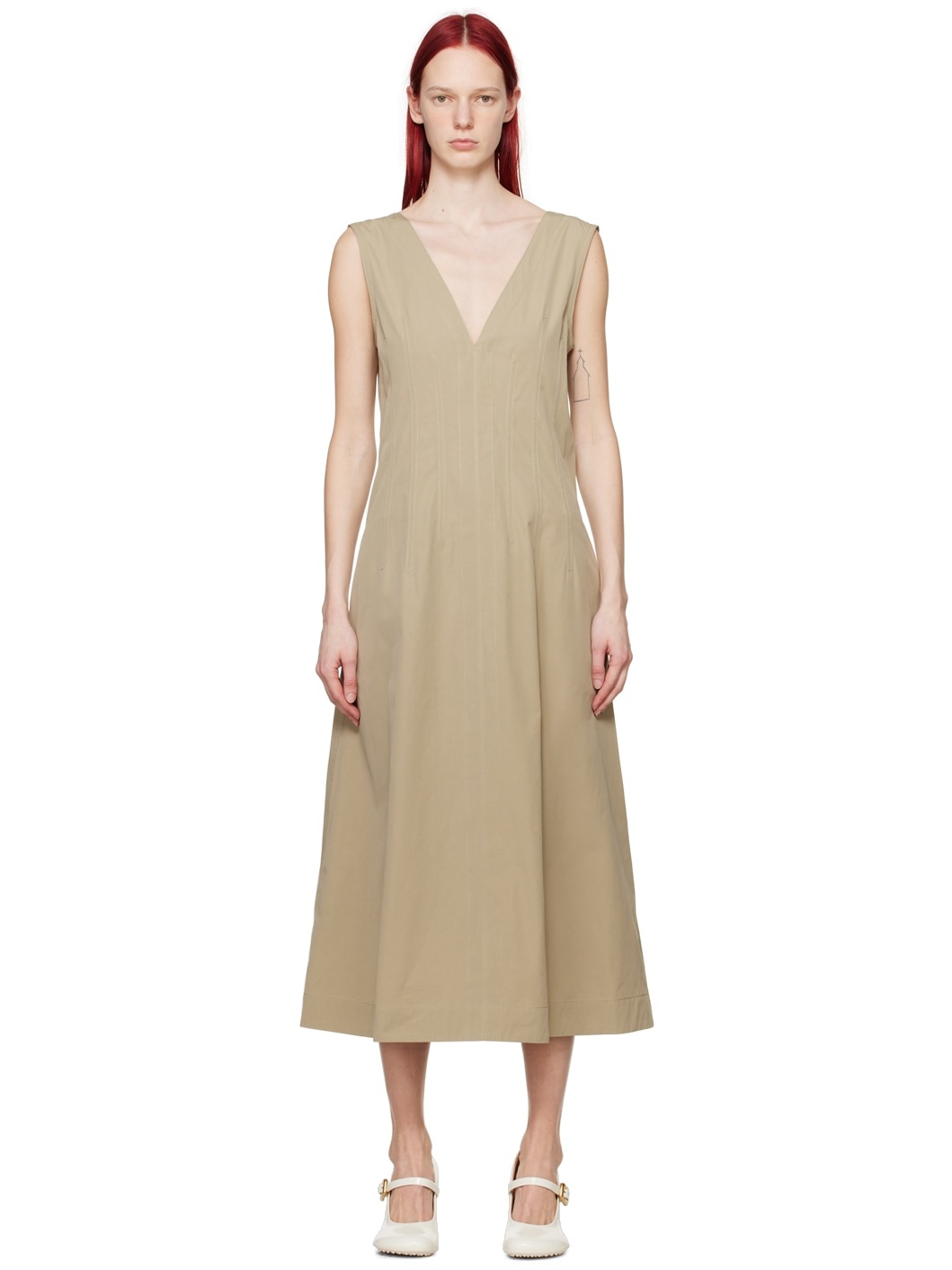 Cotton- and viscose-blend poplin dress. · Plunging V-neck · Darts at waist · Seam pockets · Self-tie straps at back collar · Concealed zip closure at low back Supplier color: Sand 72% cotton, 20% viscose, 8% polyester. Made in Italy 241798F055001