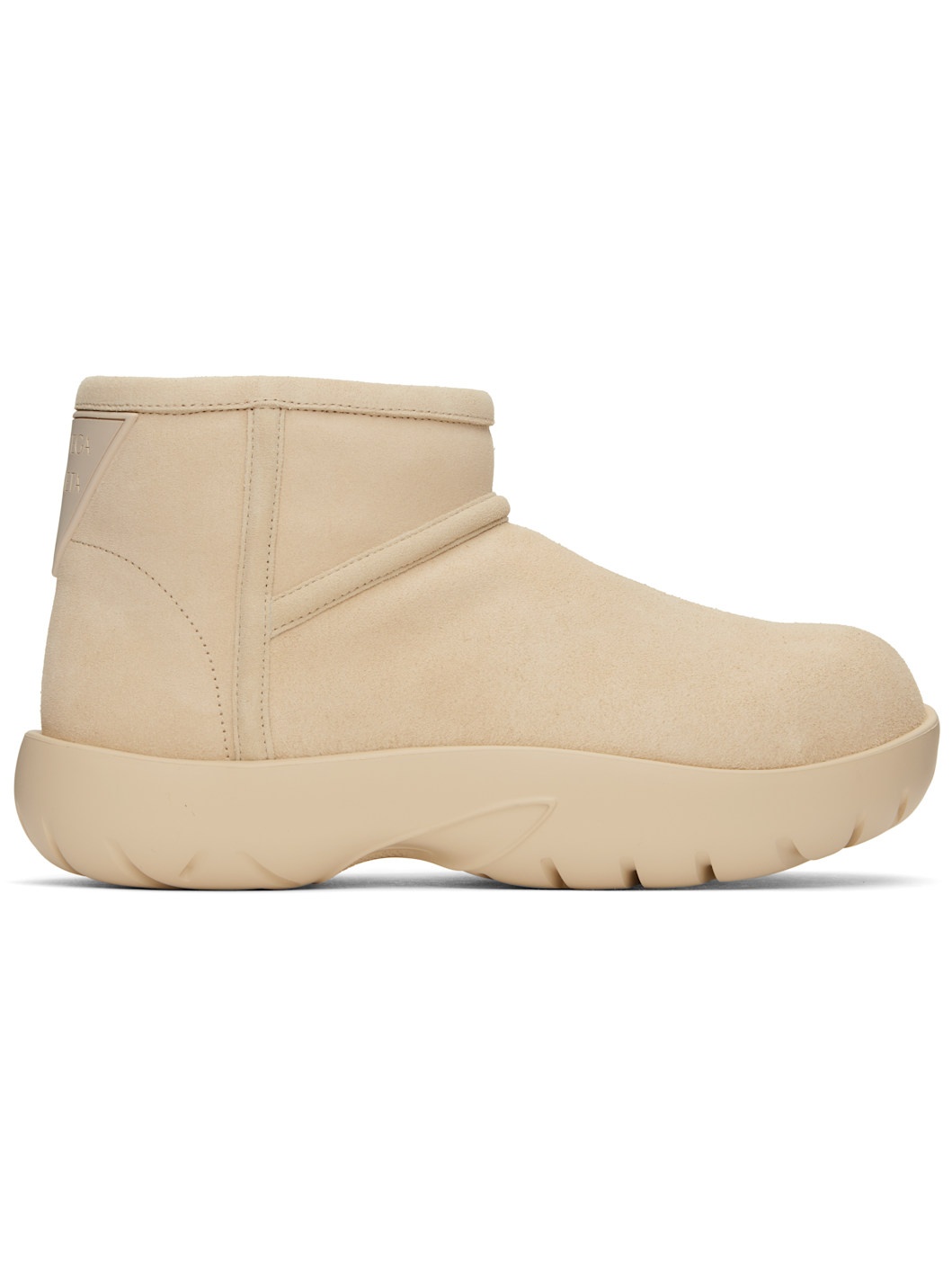 Ankle-high calfskin suede boots in beige. · Rubberized logo patch at heel collar · Shearling lambskin lining · Lightweight treaded rubber platform sole · Platform: H1.5" Supplier color: Porridge Upper: calfskin. Sole: rubber. Made in Italy 242798F113006