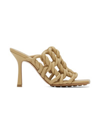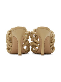 Grained nappa lambskin heeled sandals in beige. · Open square toe · Hand-twisted detailing at vamp · Logo-embossed leather footbed · Covered stiletto heel · Leather sole with rubber injections · Heel: H3.5 in Supplier color: Cane sugar Upper: lambskin. Sole: leather, rubber. Made in Italy 231798F125013