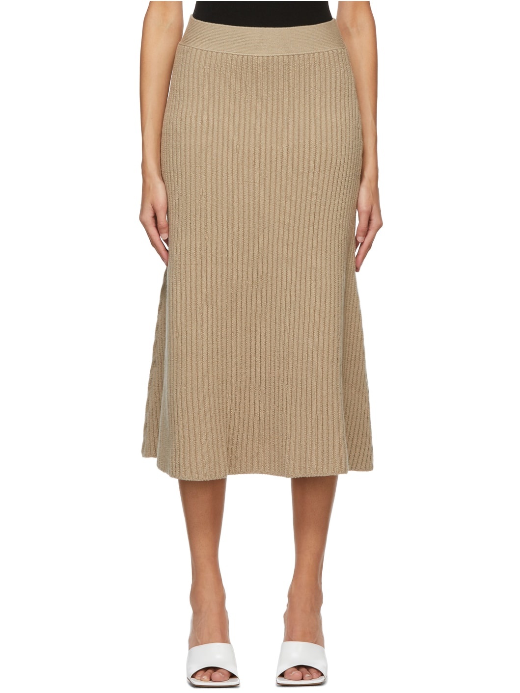Rib knit stretch wool and nylon-blend mid-length skirt in beige. High-rise. Elasticized waistband. Supplier color: Beige 90% wool, 9% polyamide, 1% elastane. Made in Italy 202798F092470