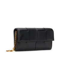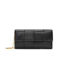 Intreccio-woven buffed leather shoulder bag in black. · Detachable chain-link shoulder strap · Foldover flap with magnetic press-stud closure · Concealed zip coin purse · Six card slots and one note slot at interior · Gold-tone hardware · H4 x W8.25 x D1.25 in Supplier color: Black/Gold Leather. Made in Italy 232798F048000