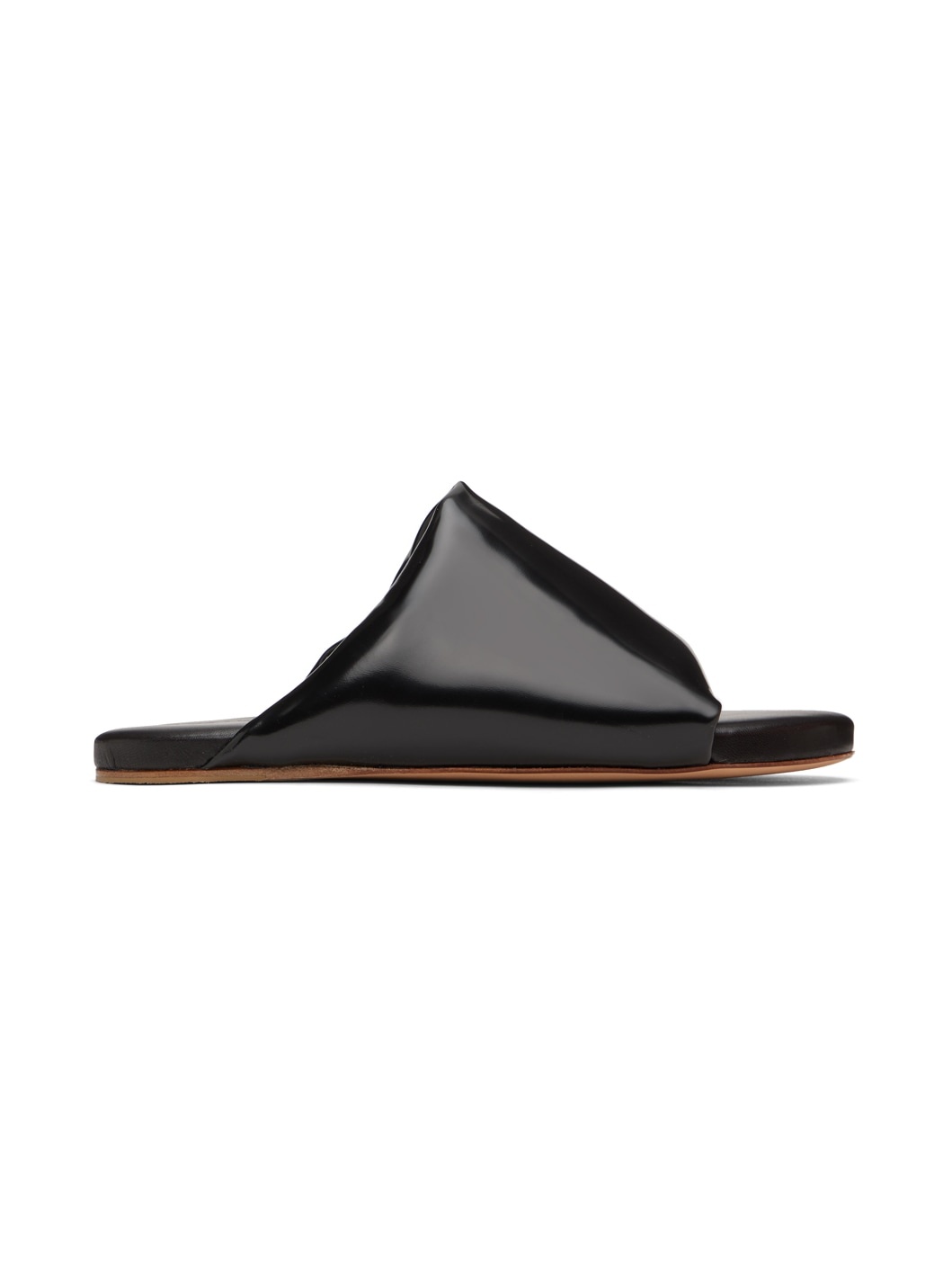 Patent lambskin slip-on sandals in black. · Open round toe · Padded strap at vamp · Logo embossed at footbed · Suede sole Supplier color: Black Lambskin. Made in Italy 231798F124003