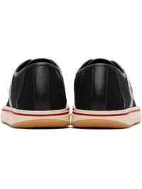 Low-top canvas and buffed leather sneakers. · Rubber cap toe · Lace-up closure · Logo hardware at tongue · Rubberized logo patch at outer side · Metal eyelets at inner side · Treaded rubber sole Supplier color: Black Upper: leather, textile. Sole: rubber. Made in Italy 252798M237004