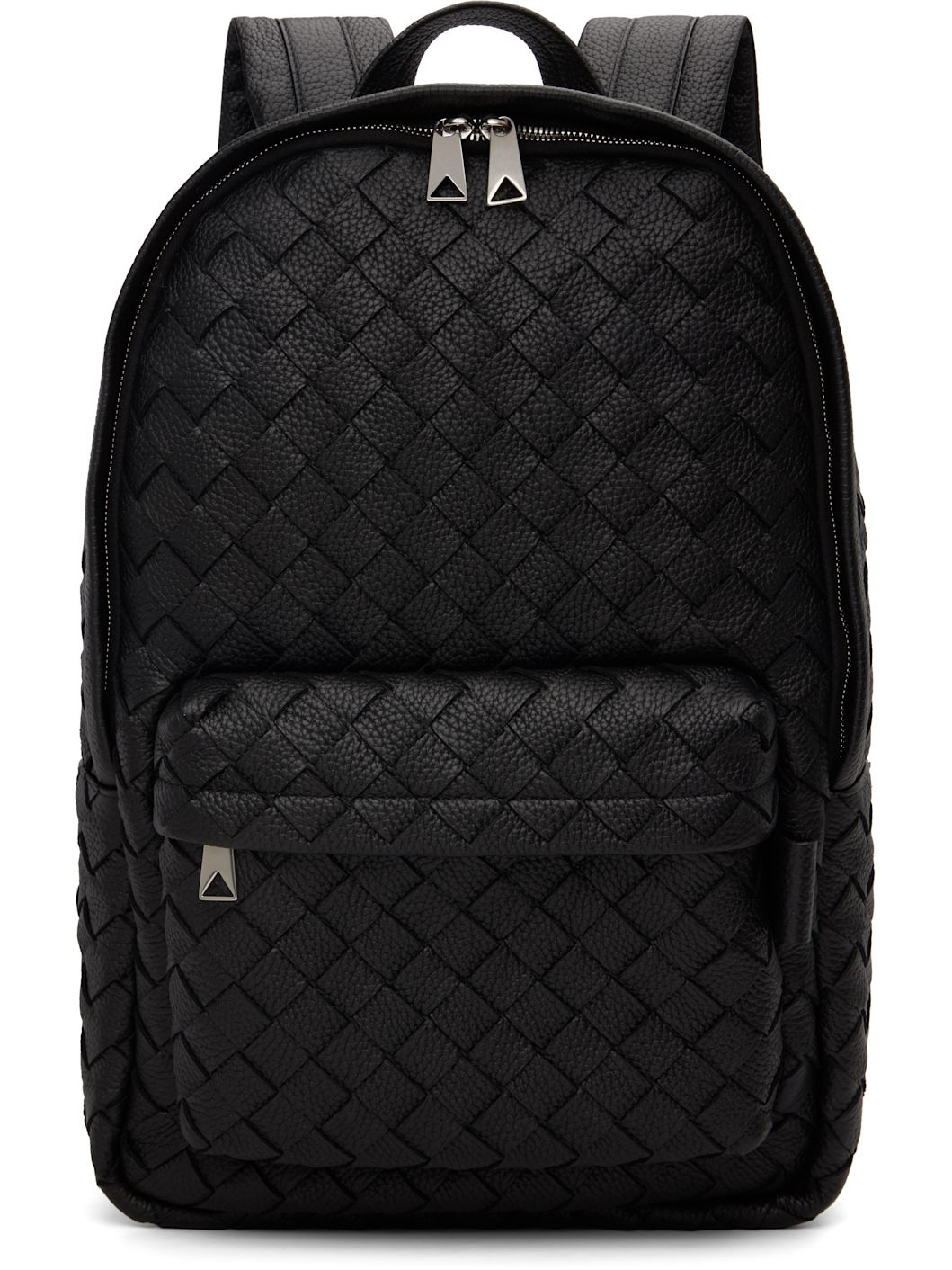 Intrecciato-woven grained calfskin backpack. · Fixed carry handle · Adjustable padded shoulder straps · Zip pocket at face · Two-way zip closure · Zip pocket and laptop compartment at interior · Canvas lining · H19" x W16" x D5" Supplier color: Black Calfskin. Made in Italy 251798M166003