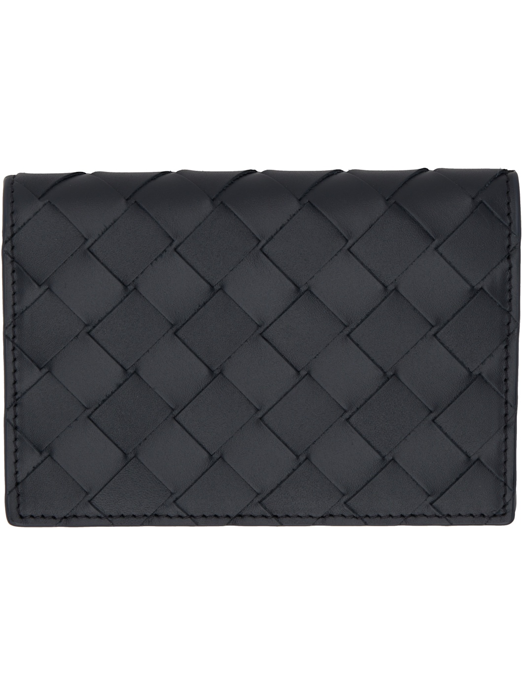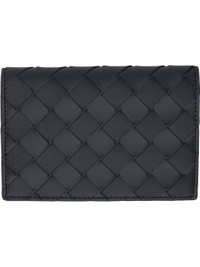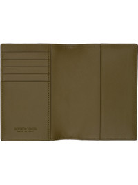 Intrecciato-woven buffed calfskin passport holder in black. · Five card slots · Two patch pockets · Buffed calfskin lining · H5.25" x W3.75" Supplier color: Shadow/Olive oil Calfskin. Made in Italy 242798M162004