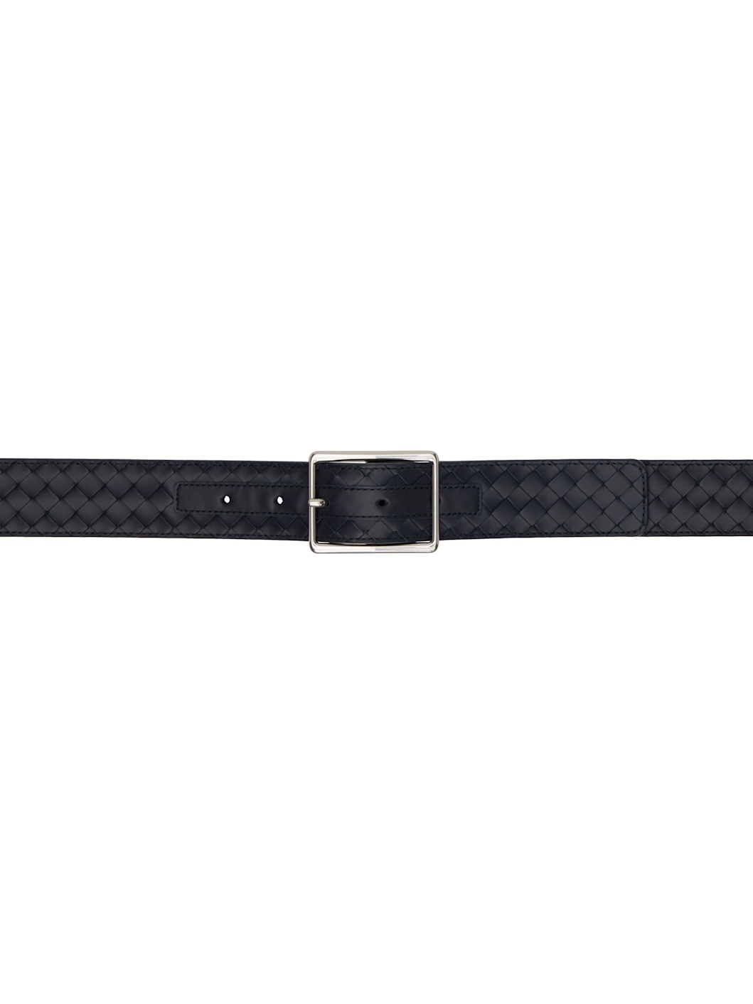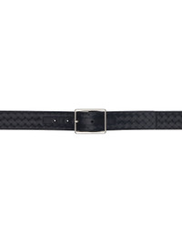 Intrecciato-woven buffed BioBasedLeather® calfskin belt in black. · Logo-engraved pin-buckle fastening · Silver-tone hardware · W1.5" Supplier color: Black Calfskin. Made in Italy 251798M131001