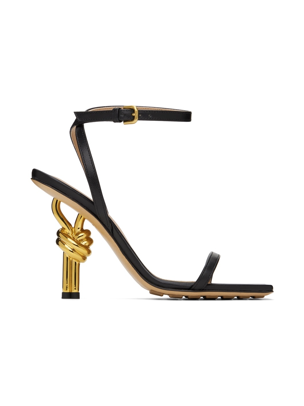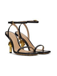 Buffed lambskin heeled sandals in black. · Open square toe · Adjustable pin-buckle ankle strap · Logo-embossed padded footbed · Sculptural metal stiletto heel with rubber injection · Leather sole with rubber injections · Gold-tone hardware · Heel: H3" Supplier color: Black Upper: lambskin. Sole: leather, rubber. Made in Italy 241798F125008