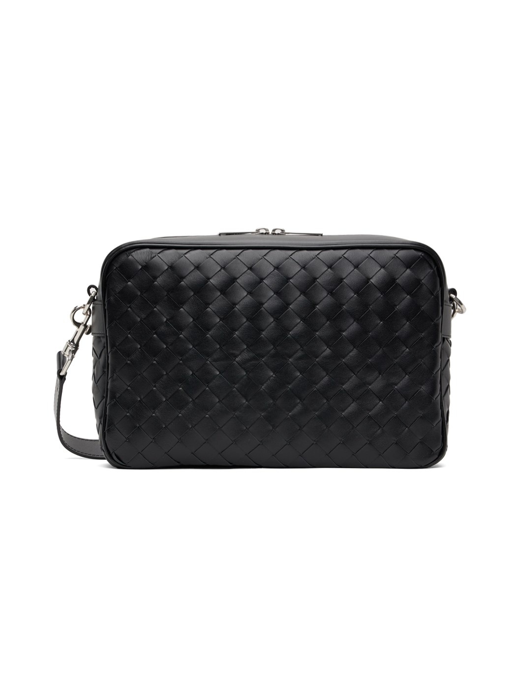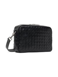 Intrecciato-woven buffed leather shoulder bag in black. · Detachable and adjustable shoulder strap · Two-way zip closure · Zip pocket and patch pockets at interior · Canvas lining · H8 x W11.5 x D3 in Supplier color: Black/Silver Leather. Made in Italy 232798M170019