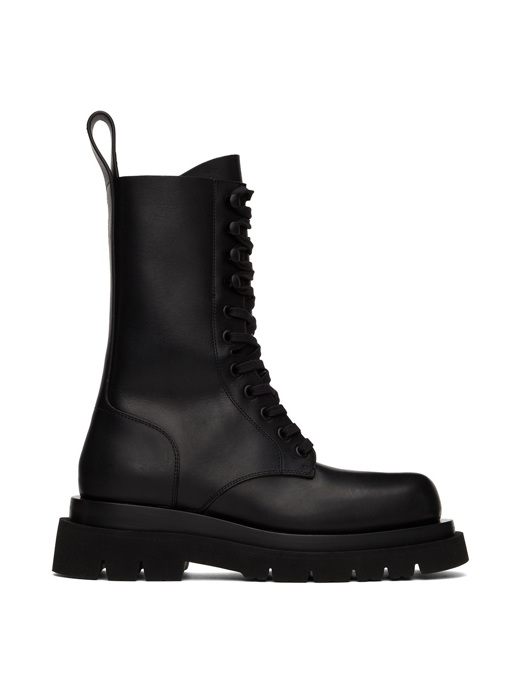 Mid-calf vegetable-tanned grained calfskin boots in black. · Lace-up closure · Pull-loop at heel collar · Stacked leather midsole · Treaded rubber outsole Supplier color: Black Upper: calfskin. Sole: rubber.