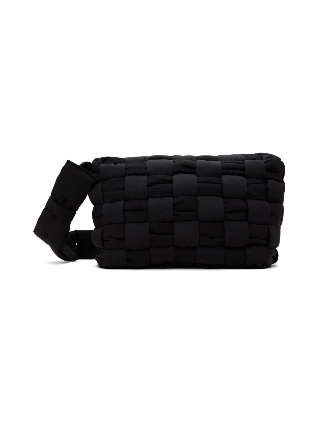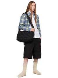 Padded intrecciato-woven nylon taffeta messenger bag in black. · Adjustable shoulder strap · Zip closure · Zip pocket at interior · Fully lined · H12" x W17" x D3" Supplier color: Black Textile. Made in Italy 232798M170039