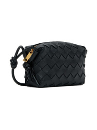 Intrecciato-woven grained lambskin shoulder bag in black. · Knotted detailing at adjustable shoulder strap · Zip closure · Calfskin lining · Gold-tone hardware · H4.5" x W5.75" x D2.5" Supplier color: Black/Gold Calfskin. Made in Italy 231798F048041