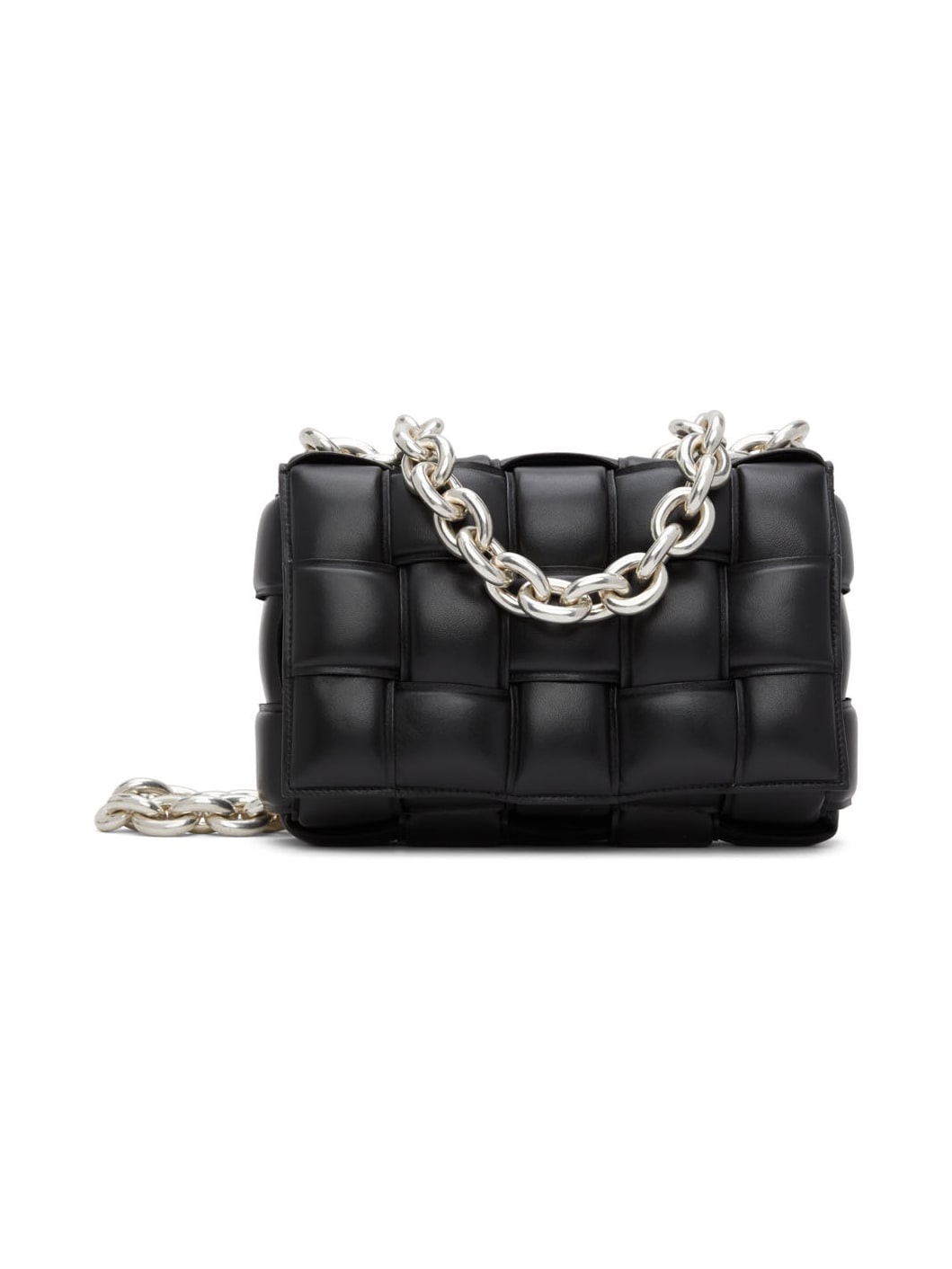 Padded intreccio-woven grained lambskin shoulder bag in black. · Curb chain carry handle and shoulder strap · Foldover flap with tab-slot fastening · Zip pocket at interior · Silver-tone hardware · H7 x W10 x D3 in Supplier color: Black Lambskin. Made in Italy 221798F048077