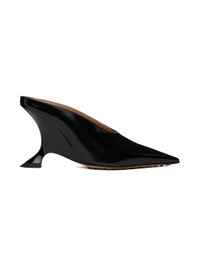Patent calfskin slip-on heels in black. · Pointed toe · Logo-embossed lambskin footbed · Buffed lambskin lining · Covered spool heel with rubber injection · Leather sole with treaded rubber injections · Heel: H3.5 in Supplier color: Black Upper: calfskin. Sole: leather, rubber. Made in Italy 231798F122014
