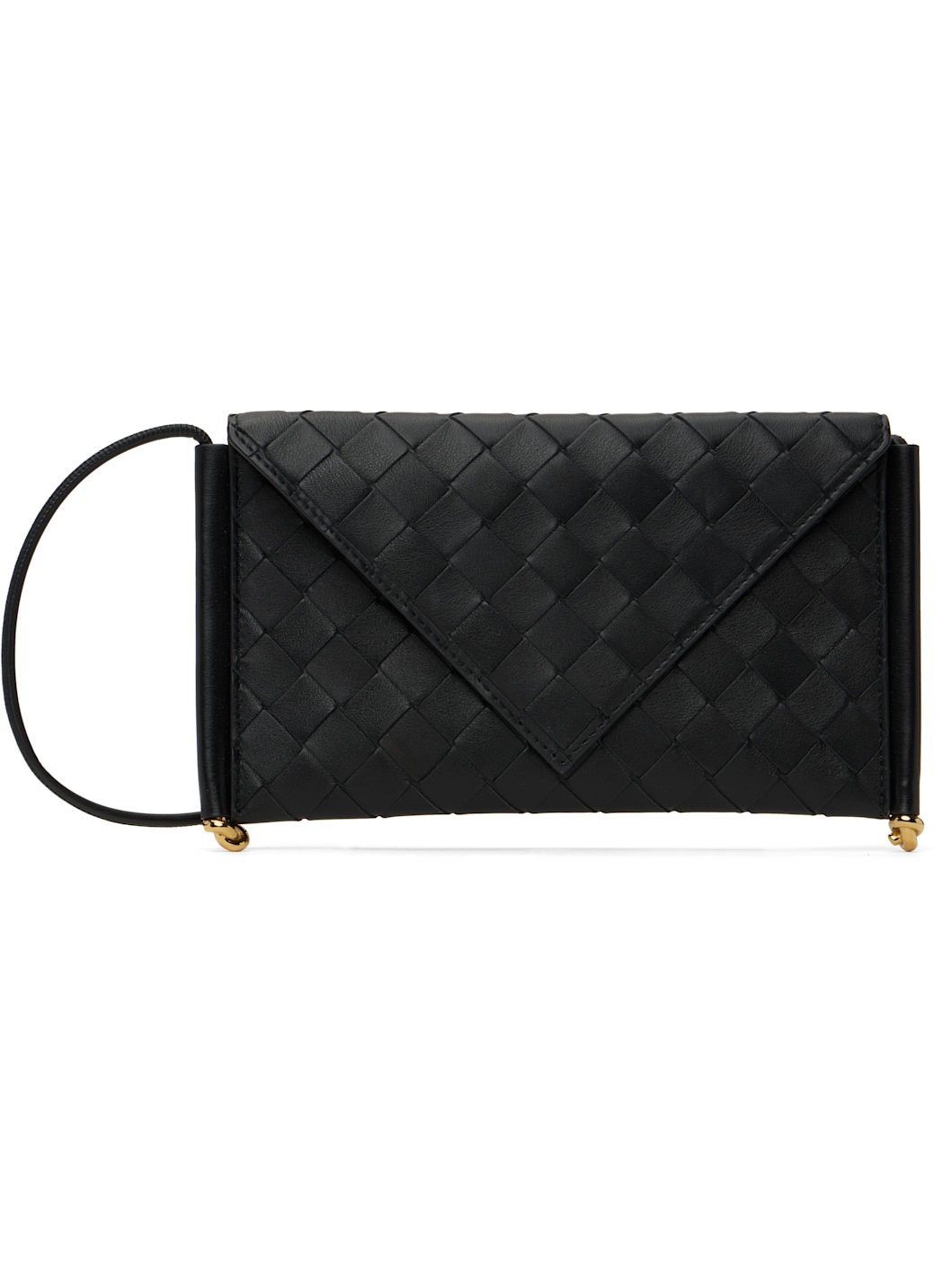 Intrecciato-woven buffed calfskin shoulder bag in black. · Crossbody strap · Magnetic flap with tab slot · Card slot at interior · Buffed calfskin lining · Brass-tone hardware · H5" x W8.5" Supplier color: Black/Muse brass Calfskin. Made in Italy 251798F048000