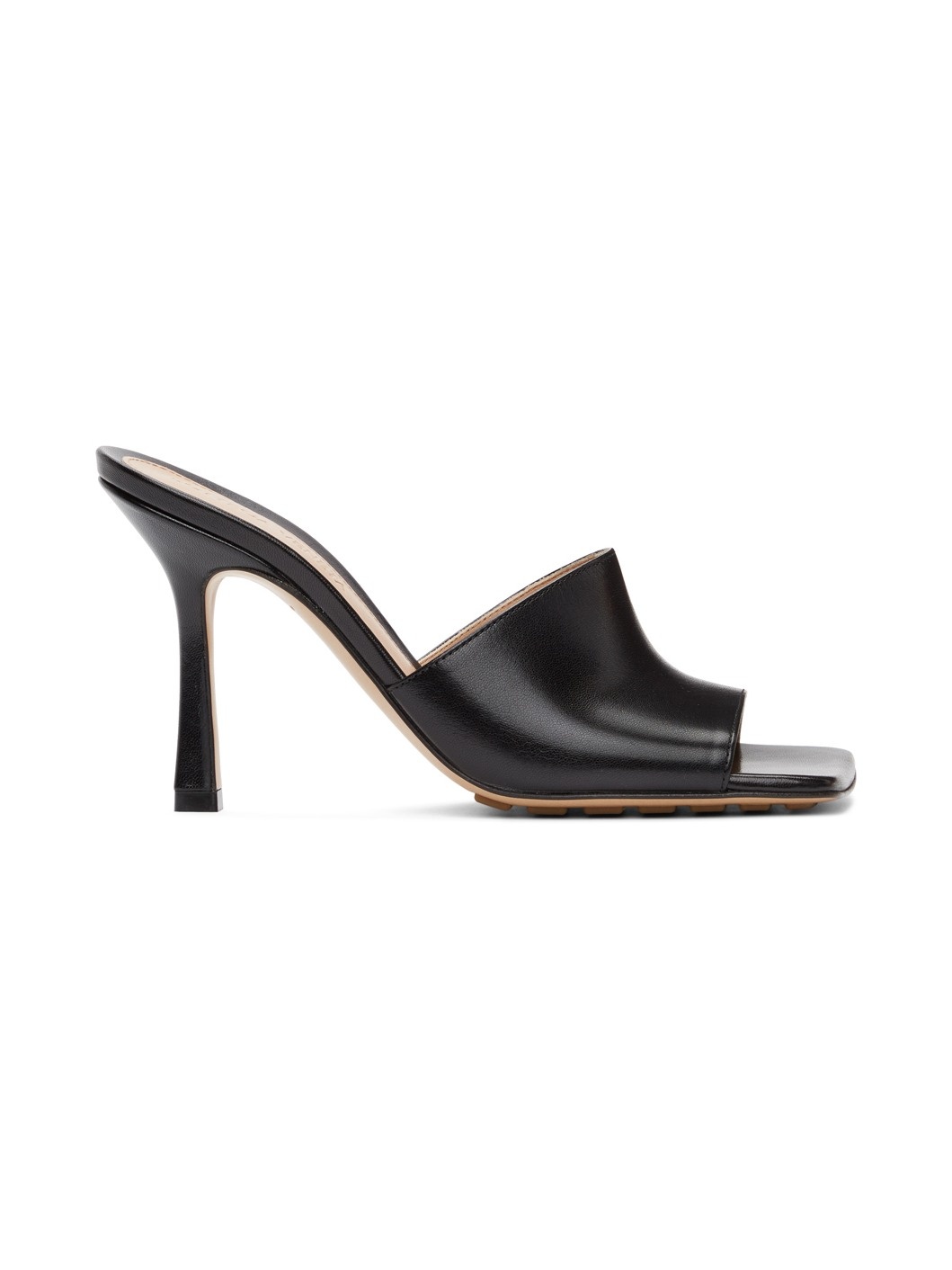 Buffed lambskin slip-on heeled sandals in black. Open square toe. Logo embossed at tan buffed lambskin footbed. Covered stiletto heel. Leather sole in tan featuring pebbled rubber injection. Approx. 3.5" heel. Supplier color: Black Upper: lambskin. Sole: leather, rubber. Made in Italy 211798F125011