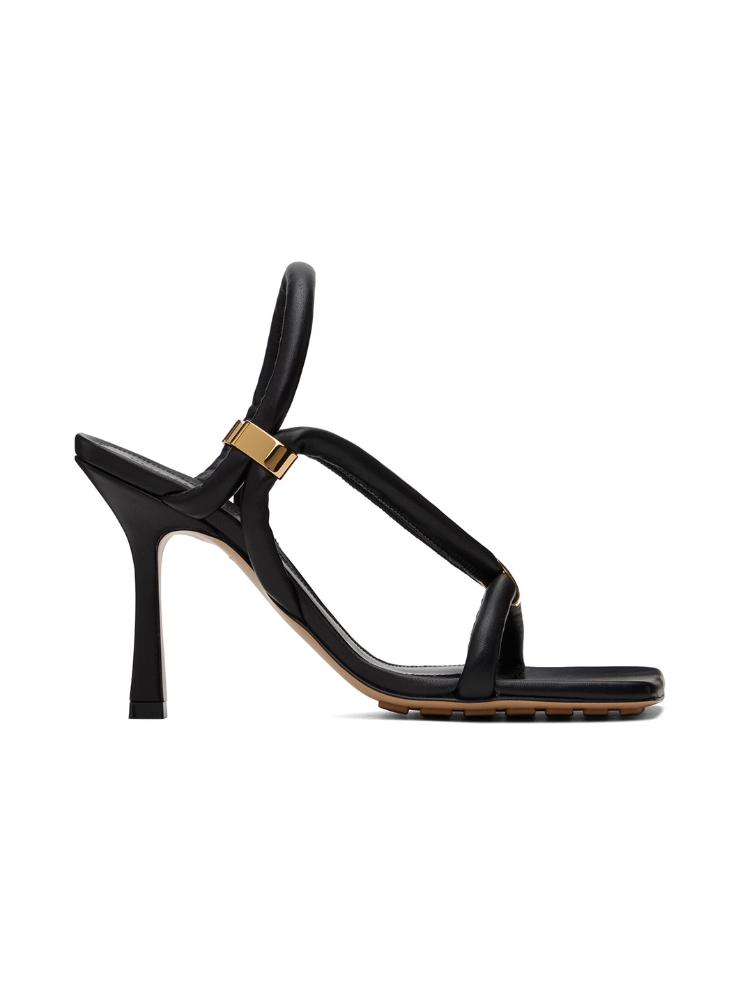 Buffed nappa lambskin heeled sandals in black. · Open square toe · Logo-embossed lambskin footbed · Covered stiletto heel with rubber injection · Leather sole with rubber injections · Gold-tone hardware · Heel: H3.5 in Supplier color: Black Upper: lambskin. Sole: leather, rubber. Made in Italy 231798F125014