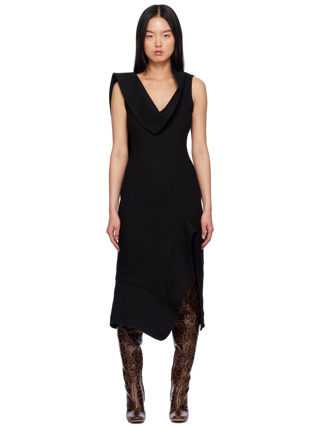 Lightweight cotton- and viscose-blend twill dress. · Draping at modified cowl neck and low back · Asymmetrical hem · Concealed zip closure at side seam · Vent at side seam · Unlined Supplier color: Black 35% cotton, 35% viscose, 25% wool, 5% polyamide. Made in Italy 232798F054001