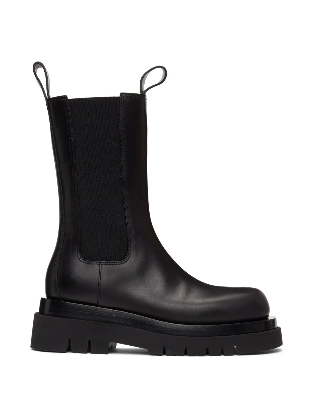 Mid-calf vegetable-tanned calfskin Chelsea boots in black. Round toe. Elasticized gusset at sides. Tonal calfskin pull-loops at collar. Stacked leather midsole. Tonal treaded rubber outsole. Supplier color: Black Upper: calfskin. Sole: rubber.
