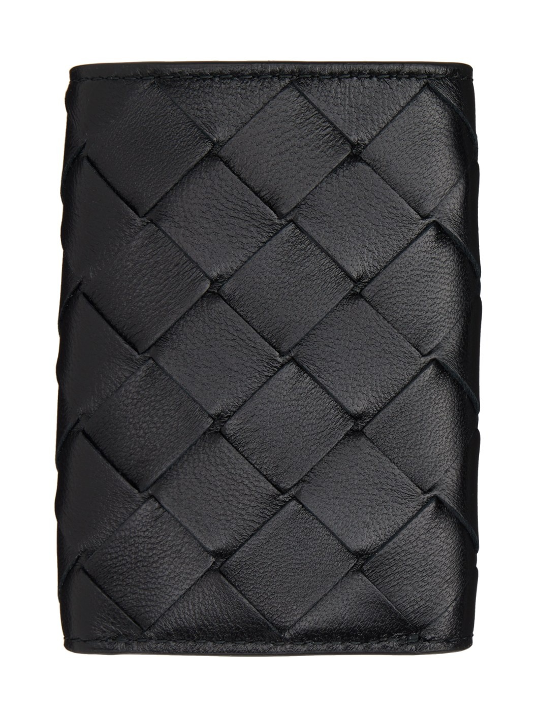 Intrecciato-woven buffed calfskin wallet in black. Burnished edges throughout. · Flap pocket at back face · Press-stud closure · Three card slots and one note slot at interior · Buffed calfskin and canvas lining · H2.5 x W3.5 x D1.25 in Supplier color: Black Lambskin. Made in Italy 232798F040000