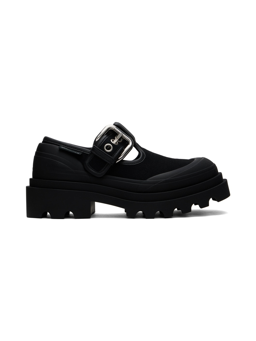 Canvas Mary Jane-style loafers in black. · Buffed leather and rubber trim throughout · Adjustable pin-buckle strap at vamp · Logo flag at outer side · Logo embossed at padded leather footbed · Canvas lining · Treaded rubber platform sole · Platform: H2" Supplier color: Black Upper: textile. Sole: rubber. Made in Italy 242798M237001