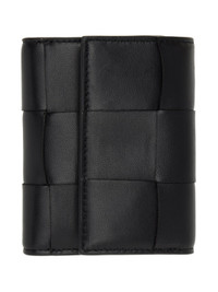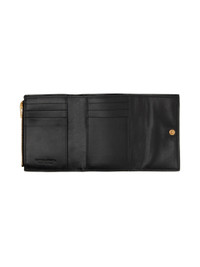 Intrecciato-woven buffed lambskin wallet in black. · Foldover flap with press-stud fastening · Six card slots · Two patch pockets · Central note slot · Zip coin compartment · Buffed calfskin lining · Gold-tone hardware · H3.5 x W4.5 x D0.75 in Supplier color: Black/Gold Lambskin. Made in Italy 231798F040000