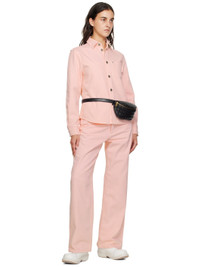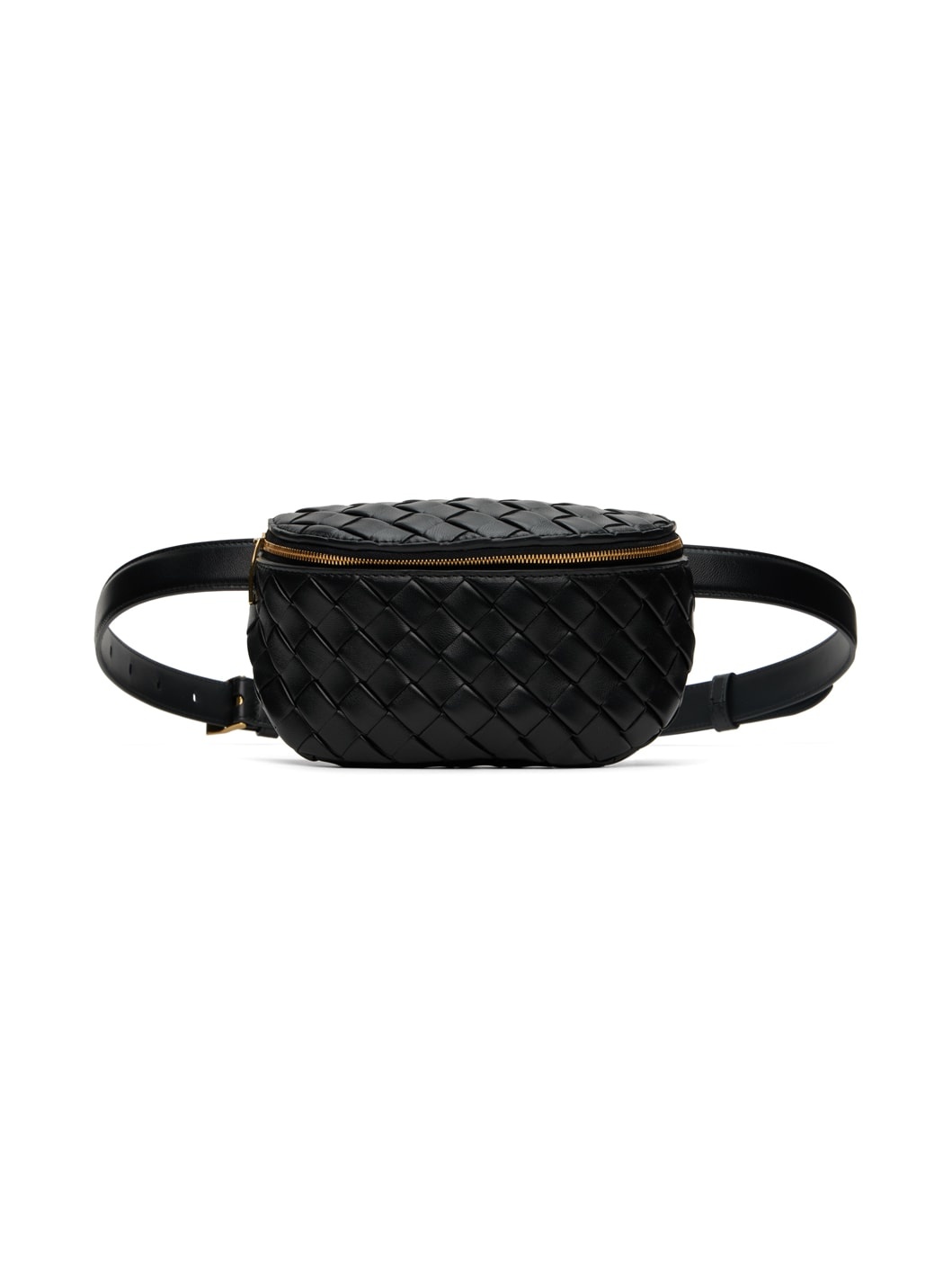 Intrecciato-woven grained lambskin pouch in black. · Adjustable pin-buckle belt-style strap · Zip closure · Lanyard clasp at interior · Grained leather lining · H4 x W7.5 x D3.25 in Supplier color: Black/Brass Lambskin. Made in Italy 232798F045001