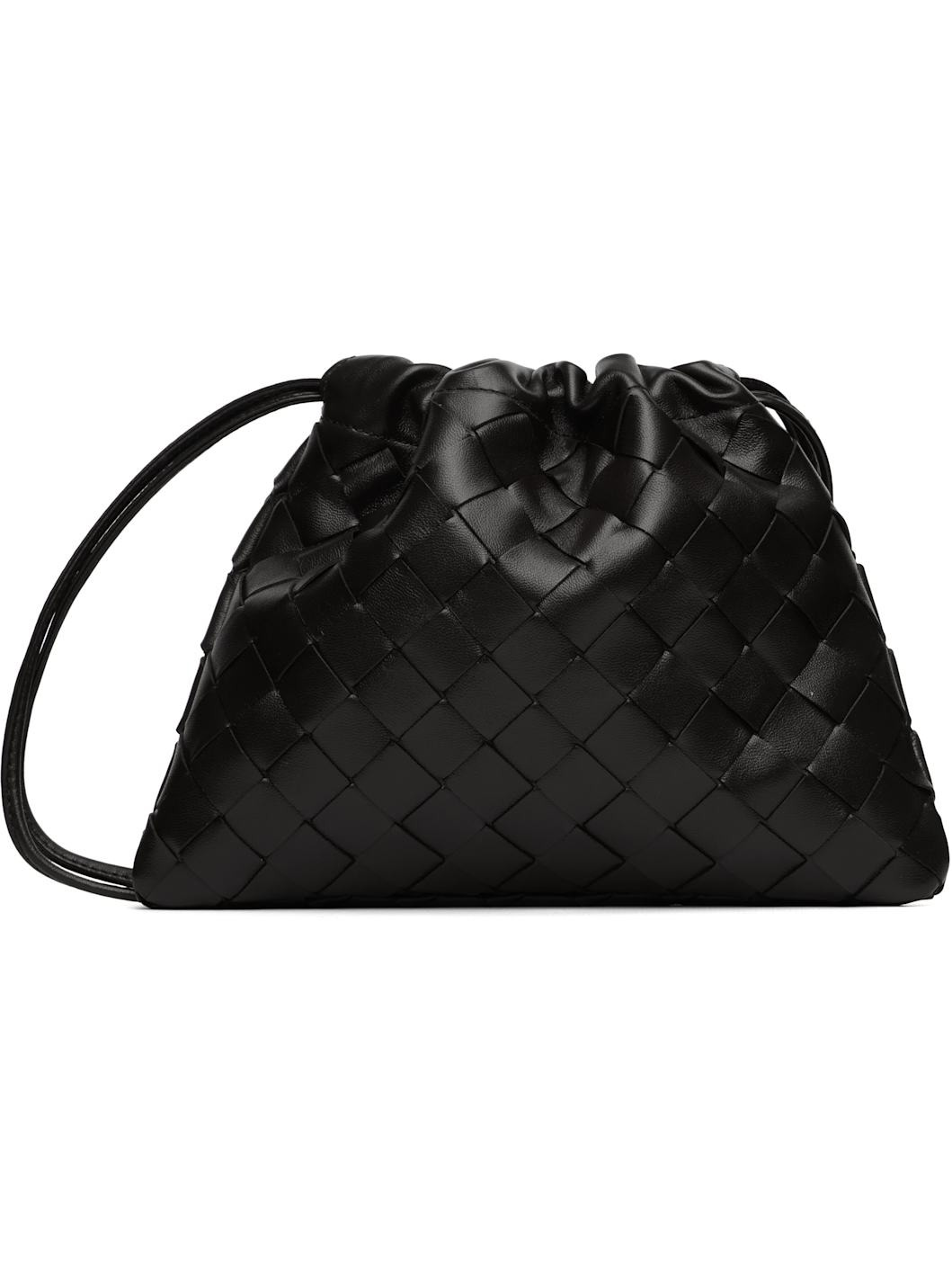 Intrecciato-woven buffed calfskin shoulder bag. · Twin leather shoulder straps · Connecting tab at straps for crossbody styling · Drawstring closure · Nylon taffeta lining · H6" x W8" x D1" Supplier color: Black Calfskin. Made in Italy 252798F048028