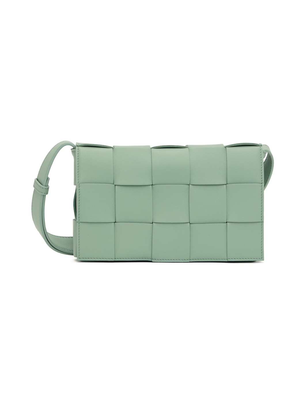Intreccio-woven buffed lambskin messenger bag in blue. · Adjustable post-stud shoulder strap · Foldover flap with magnetic closure - Zip pocket at interior · Gold-tone hardware · H5.5 x W9 x D2 in Supplier color: New sauge/Gold Lambskin.