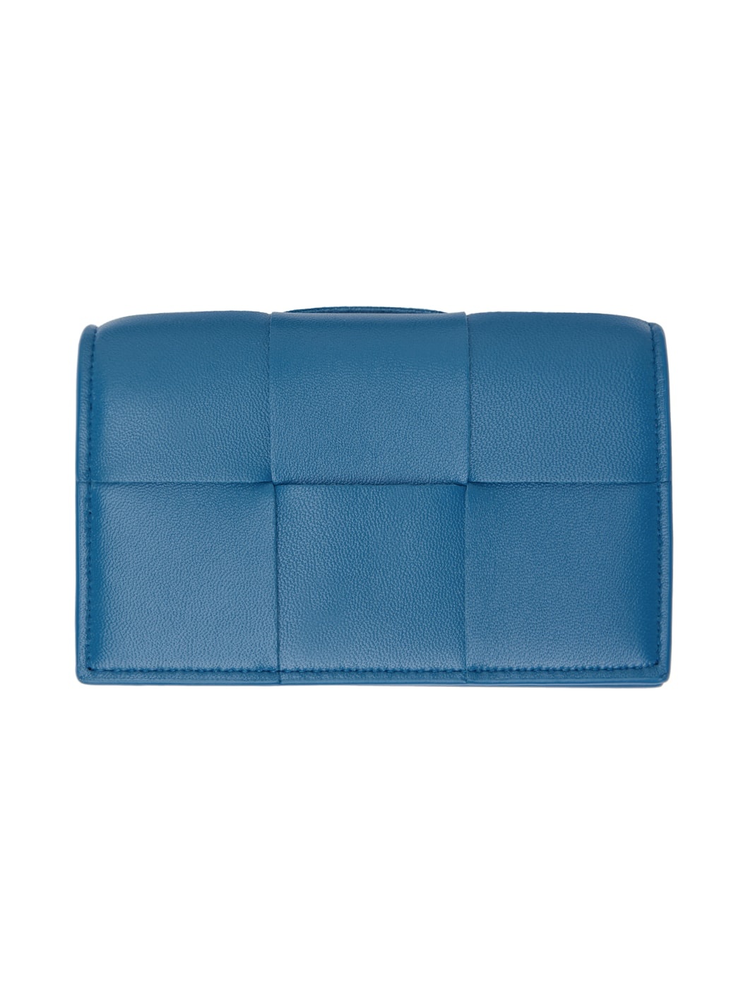 Intreccio-woven grained lambskin card holder in blue. · Press-stud flap · Card slot at interior · Patch pocket at interior · Grained calfskin lining · H3" x W4.75" x D1" Supplier color: Deep pacific Lambskin. Made in Italy 241798F037011