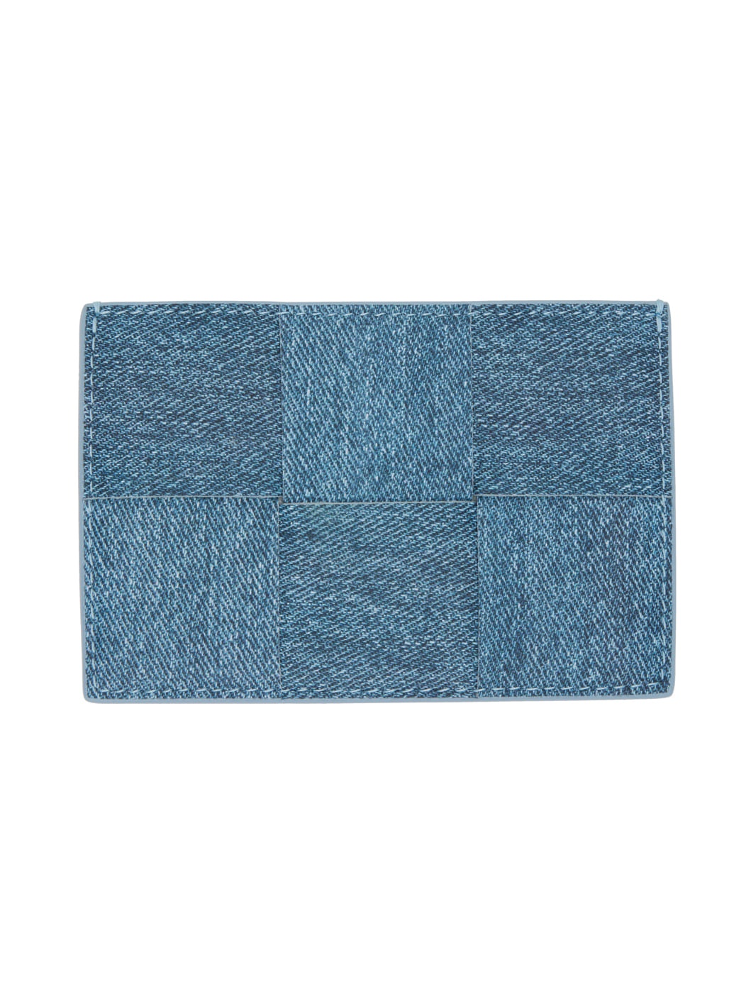Intreccio-woven nappa lambskin card holder in blue. · Trompe-l'œil denim print throughout · Four card slots · Central note slot · Grained lambskin lining · H3" x W4.5" Supplier color: Blue melange 100% lambskin. Made in Italy 241798F037021