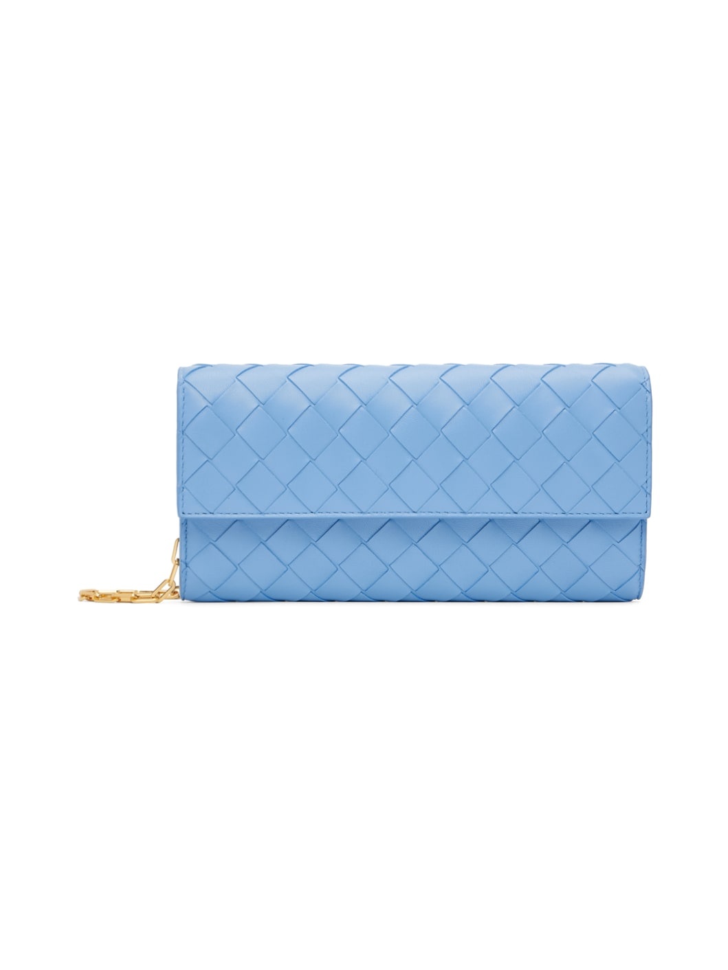 Intrecciato-woven grained calfskin shoulder bag in blue. · Detachable chain-link shoulder strap · Foldover flap with magnetic press-stud closure · Zip pocket at interior · Six card slots and one note slot · Buffed calfskin lining · Gold-tone hardware · H4 x W8.25 x D1.5 in Supplier color: Windswept/Gold Calfskin. Made in Italy 231798F048094