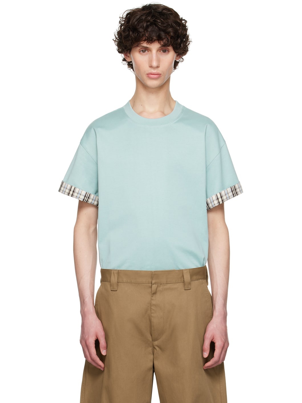 Cotton jersey T-shirt. · Rib knit crewneck · Dropped shoulders · Rolled cuffs · Logo embroidered at inner cuff · Check pattern at cotton poplin lining Supplier color: Steel blue Body: 100% cotton. Lining: 100% cotton. Trim 1: 98% cotton, 2% elastane. Trim 2: 100% polyester. Made in Italy 242798M213000