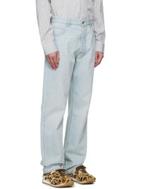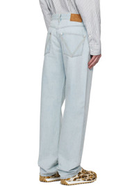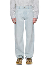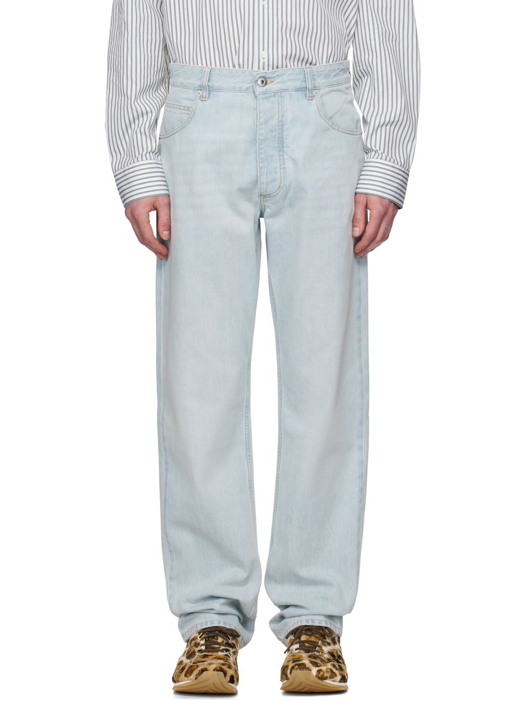 Straight-leg washed non-stretch denim jeans. Fading and subtle whiskering throughout. · Mid-rise · Belt loops · Five-pocket styling · Button fly · Intrecciato-woven suede patch at back waistband · Logo embroidered at back pockets · Logo-engraved silver-tone hardware · Contrast stitching in tan Supplier color: Light blue 100% cotton. Made in Italy 251798M191004