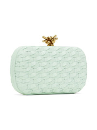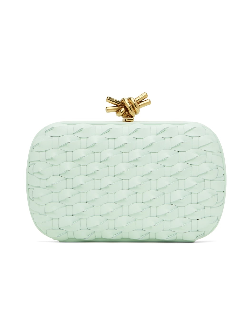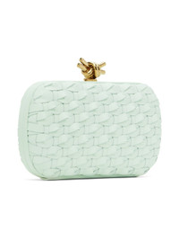 Intrecciato-woven buffed calfskin clutch in blue. · Graphic hardware at hinged closure · Buffed calfskin lining · H5 x W8 x D2.25 in Supplier color: Glacier Calfskin. Made in Italy 232798F044000