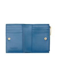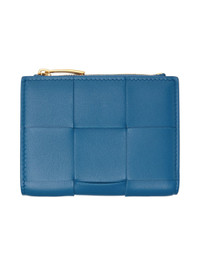 Intreccio-woven buffed lambskin bifold wallet in blue. · Press-stud closure · Six card slots · Two patch pockets · One note slot · Zip coin compartment · Buffed calfskin interior · Gold-tone hardware · H3 x W4.5 x D1 in Supplier color: Deep pacific Lambskin. Made in Italy 241798F040001