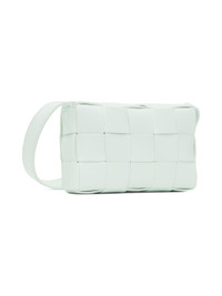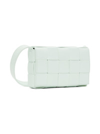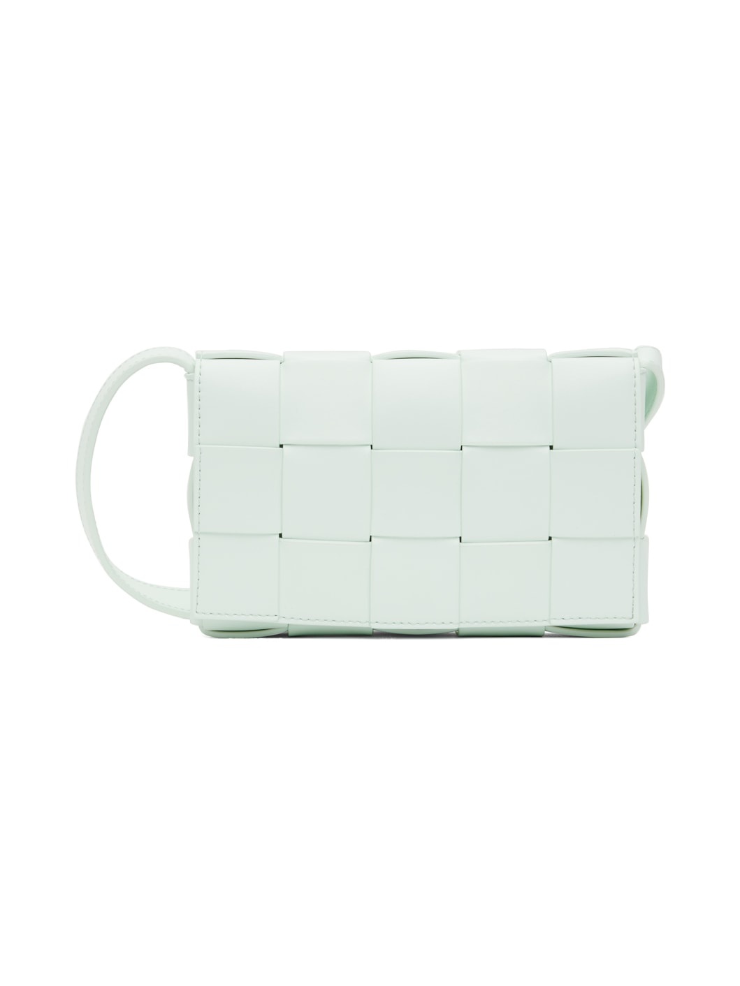 Intreccio-woven buffed lambskin messenger bag in blue. · Logo hardware at adjustable shoulder strap · Foldover flap with magnetic closure · Zip pocket at interior · Unlined · H4.5 x W7 x D2 in Supplier color: Glacier/Silver Lambskin. Made in Italy 232798M170013