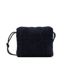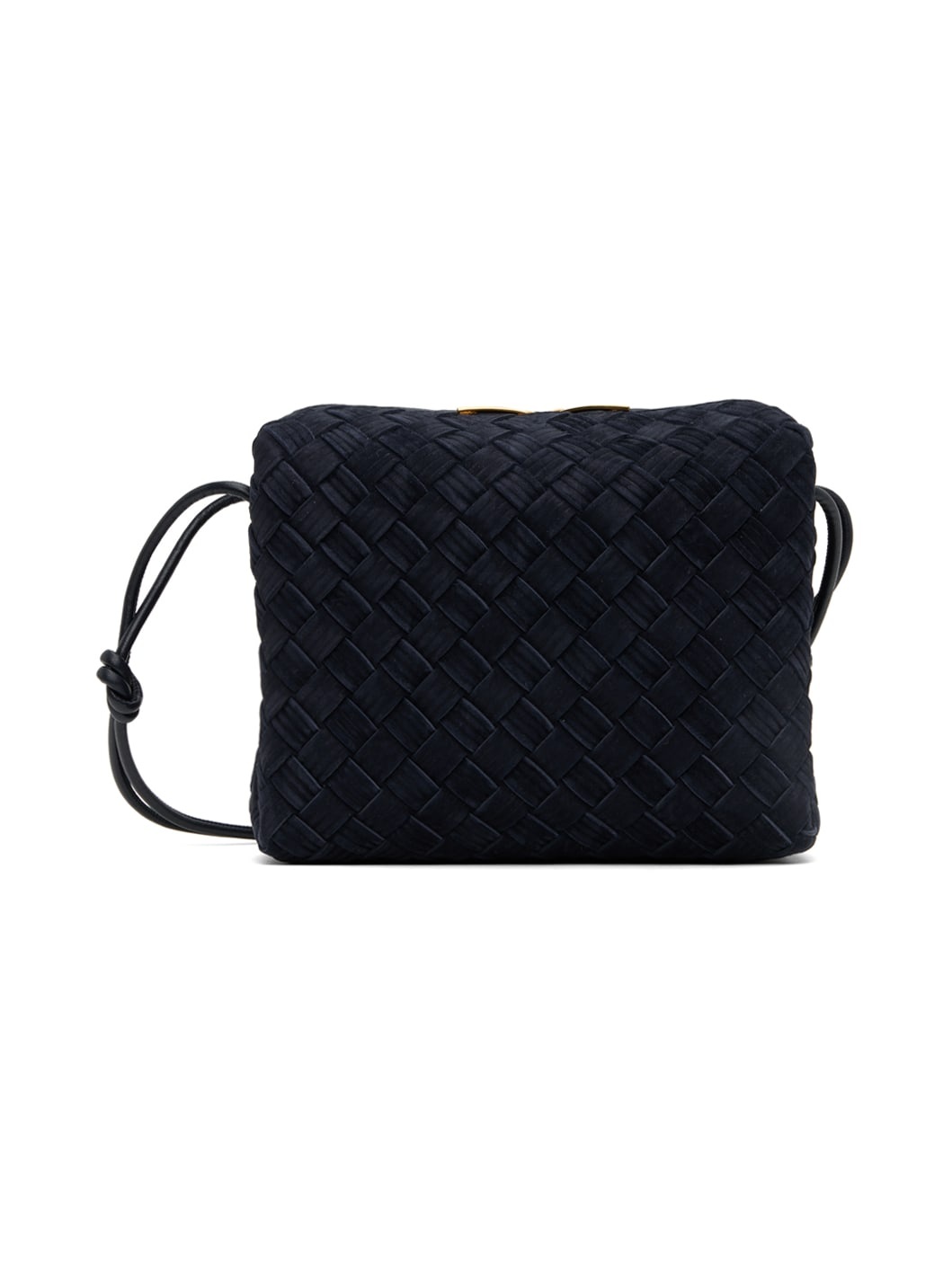 Intrecciato-woven suede shoulder bag in blue. · Knotted detailing at fixed shoulder strap · Two-way zip closure · Grained leather lining · H6.5 x W8 x D4 in Supplier color: Space/Gold
