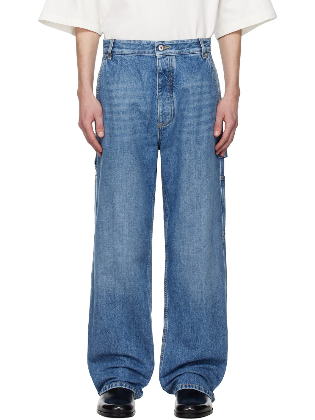Non-stretch denim jeans. Fading and whiskering throughout. · Belt loops · Five-pocket styling · Button fly · Patch pockets at outseam · Hammer loop and patch pocket at outseam · Logo patch at back pocket · Contrast stitching in tan Supplier color: Mid blue Body: 100% cotton. Lining: 65% polyester, 35% cotton. Made in Italy 251798M186001