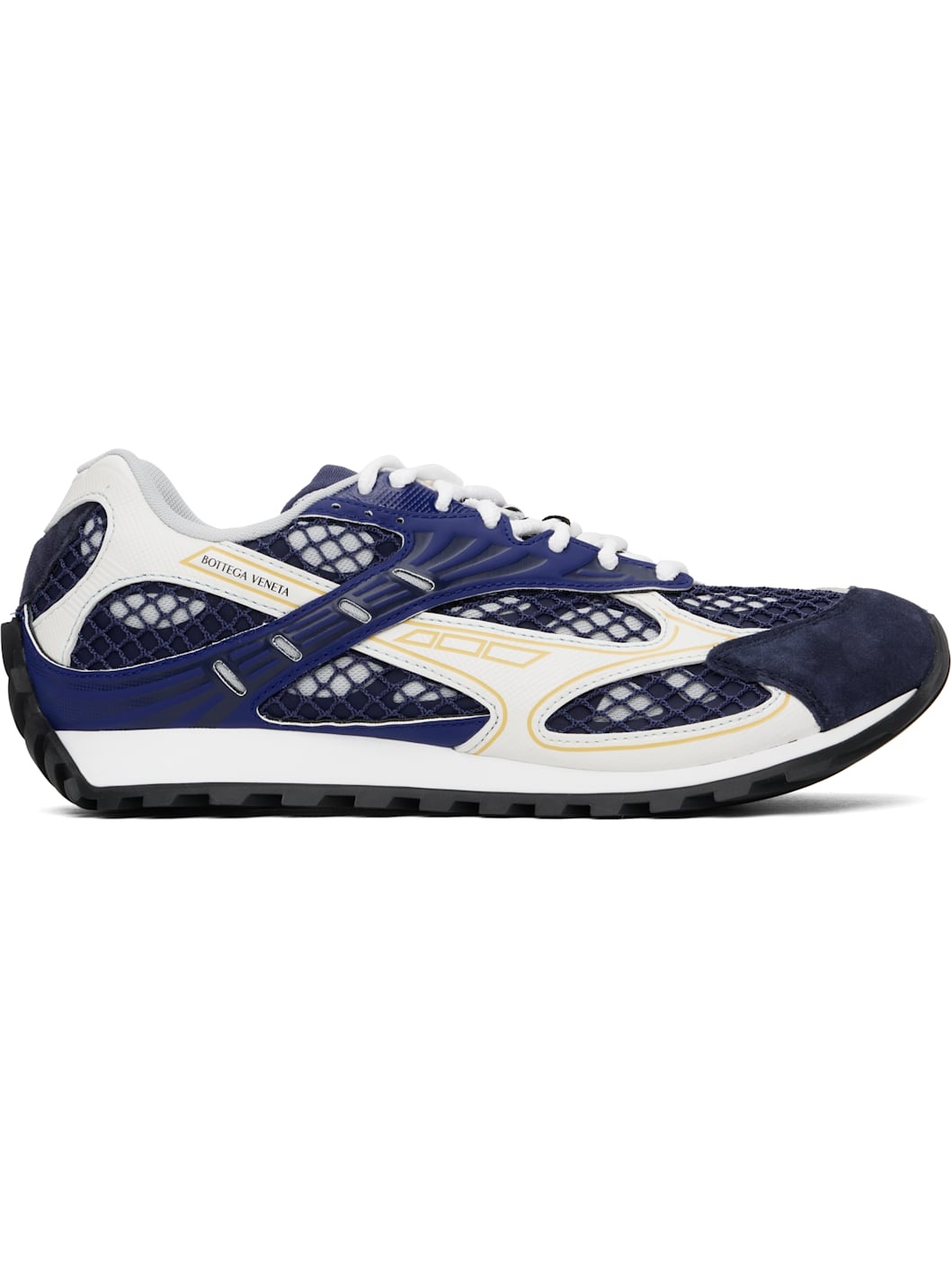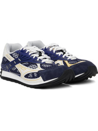 Low-top paneled buffed calfskin, calfskin suede, and mesh sneakers in blue, white, and gray. · Lace-up closure · Logo patch at padded tongue · Padded collar · Logo bonded at outer side · Pique lining · Treaded rubber sole Supplier color: Cruise/Mist Upper: calfskin, cotton, textile. Sole: rubber. Made in Italy 251798M237000