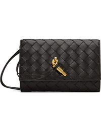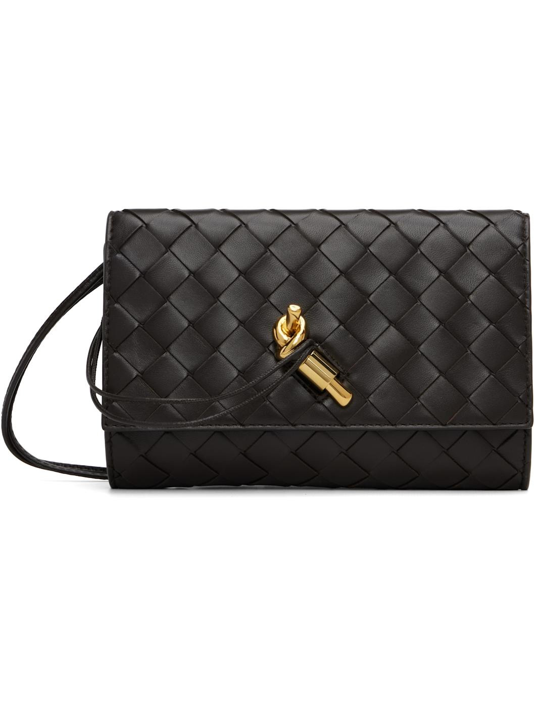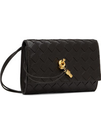 Intrecciato-woven lambskin shoulder bag. · Sliding cord shoulder strap · Knot hardware at tab-slot flap · Card slots at calfskin interior · Gold-tone hardware · H5" x W7.5" x D1" Supplier color: Fondant Lambskin. Made in Italy 252798F048003