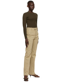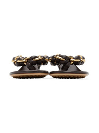 Nappa lambskin slip-on heeled sandals in brown. Open round toe. Thong-style braided leather and chain link strap. Logo embossed at padded leather footbed. Kitten heel. Leather outsole in beige featuring rubber injections. Gold-tone hardware. Approx. 2" heel. Supplier color: Fondant Upper: lambskin. Sole: leather, rubber. Made in Italy 211798F125034