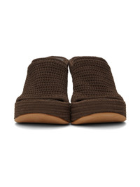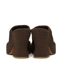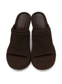 Knit slip-on heeled sandals in brown. Open round toe. Logo embossed at tonal leather footbed. Tonal leather lining. Tonal covered block heel and platform midsole. Leather outsole in brown. Approx. 4" heel; 1.5" platform. Supplier color: Ebony Upper: textile. Sole: leather. Made in Italy 211798F125040