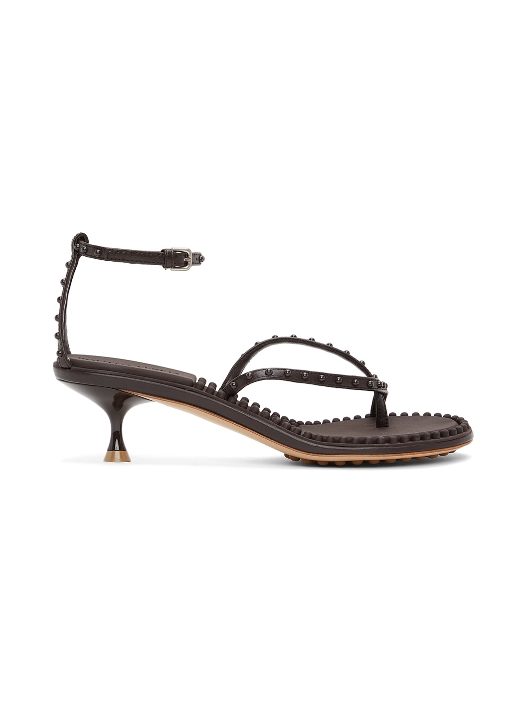 Buffed lambskin heeled sandals in brown. Tonal hemisphere studs throughout. Open round toe. Adjustable ankle strap with pin-buckle fastening. Covered kitten heel. Leather outsole in beige with rubber injections. Silver-tone hardware. Approx. 2" heel. Supplier color: Fondant Upper: lambskin, rubber. Sole: leather. Made in Italy 211798F125044