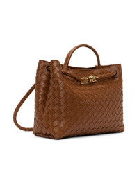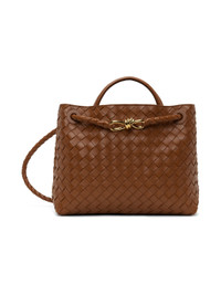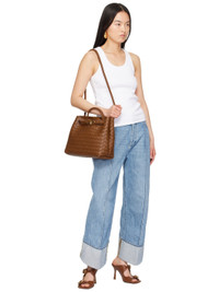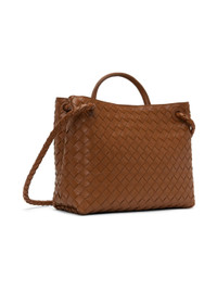 Intrecciato-woven grained nappa lambskin tote in brown. · Rolled carry handle · Knotted hardware at sliding crossbody strap · Magnetic closure · Two-compartment interior · Zip pocket and patch pocket · Grained lambskin interior · Logo-engraved gold-tone hardware · H10" x W12.5" x D4.5" Supplier color: Cognac Lambskin. Made in Italy 241798F049005