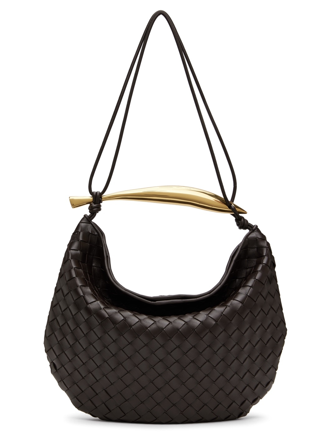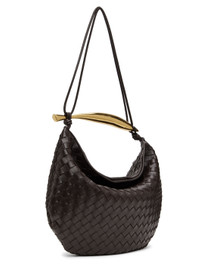 Intrecciato-woven buffed lambskin shoulder bag in brown. · Metal carry handle at top · Fixed shoulder strap · Magnetic closure · Detachable zip pouch at interior · Unlined · Gold-tone hardware · H13 x W15 x D1 in Supplier color: Fondant/Brass Lambskin. Made in Italy 232798F048030
