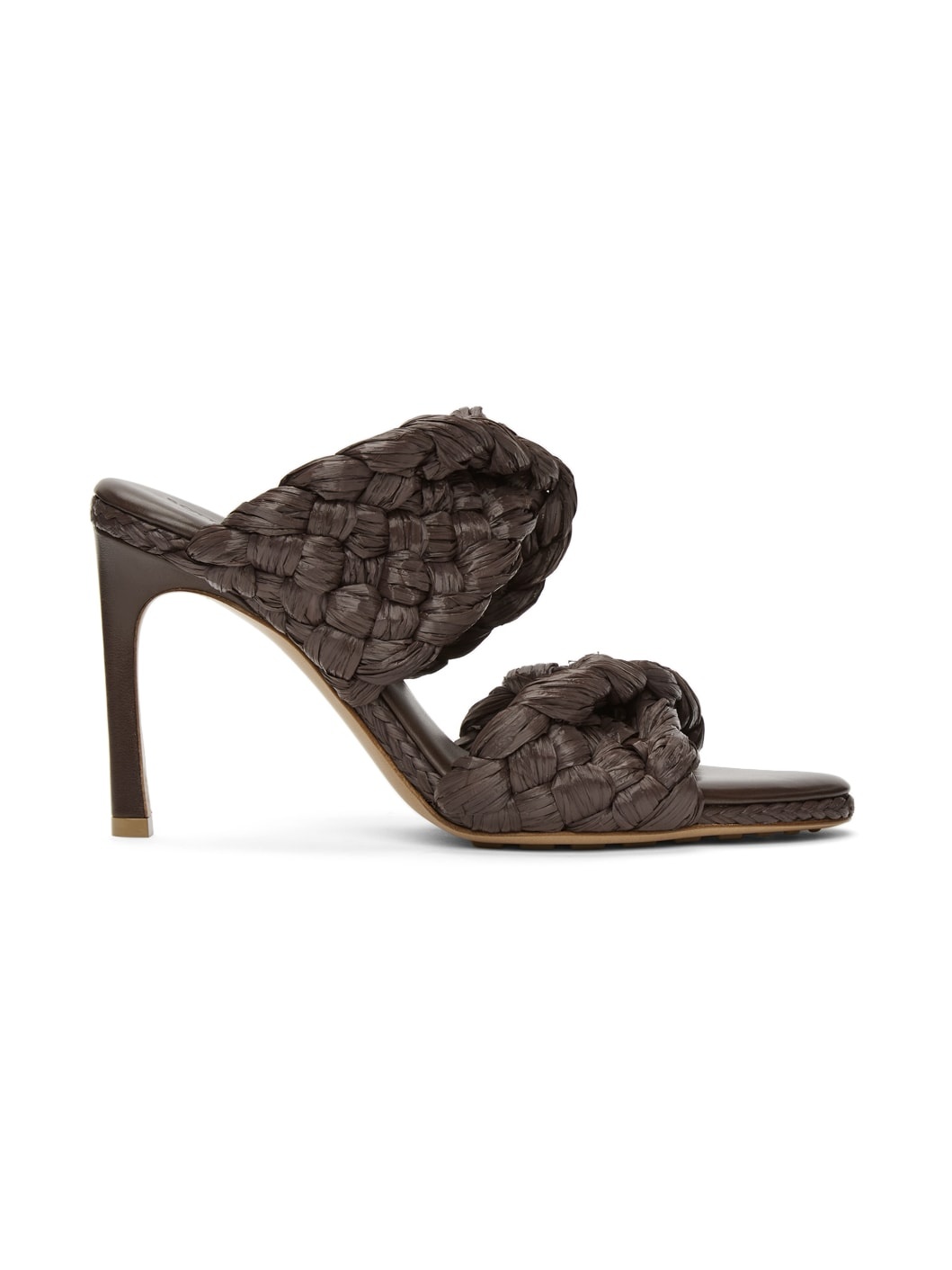 Intrecciato-woven raffia slip-on heeled sandals in brown. Open almond toe. Logo embossed at tonal buffed leather footbed. Covered stiletto heel. Leather sole in tan with pebbled rubber injections. Approx. 3.5" heel. Supplier color: Bitter chocolate Upper: textile. Sole: leather, rubber. Made in Italy 211798F125027