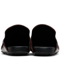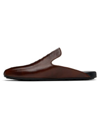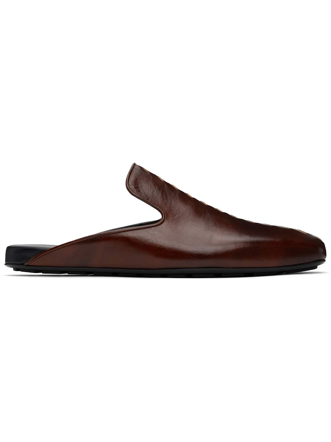 Buffed calfskin slippers in brown. · Square toe · Intrecciato-woven detailing at vamp · Logo embossed at padded footbed · Buffed lambskin lining · Leather sole with rubber injections Supplier color: Cordia wood Upper: calfskin. Sole: leather, rubber. Made in Italy 251798M231004